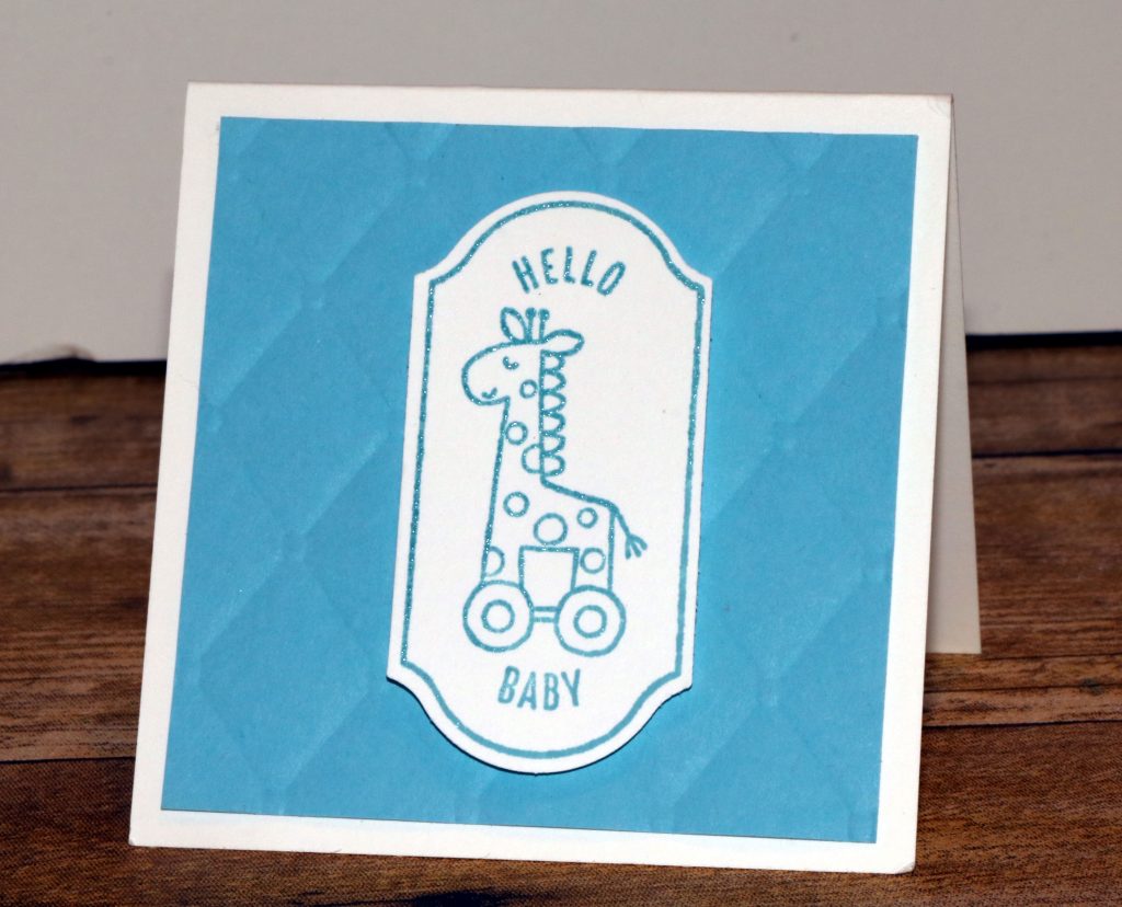 I was so excited to meet my new nephew! I came home, wrapped the gift and went to my card stash. Low and behold all I had was cards for baby girls. This would not do! Luckily I had just received my latest order with the Tufted textured embossing folder and the ??? hostess set. I pulled them out, put this card together and out the door I went (well I did snap a picture first.