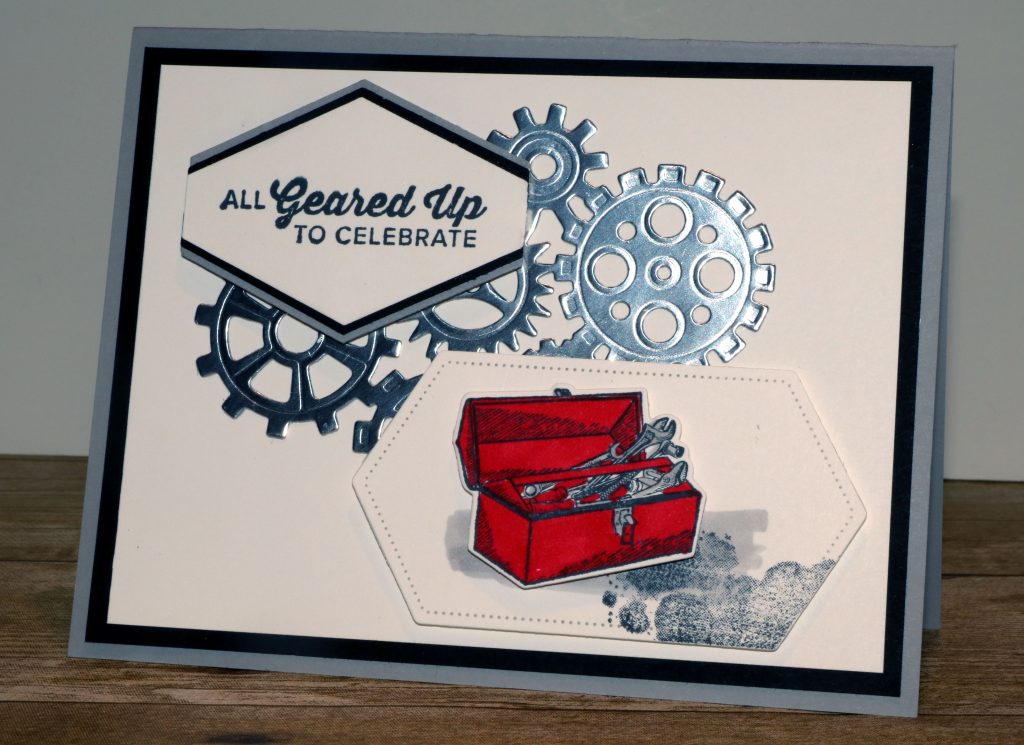 Since we had to put my mom in a home my dad has found himself having to take care of cards for all types of occaisions. Rather than go to the local store, he picks up the phone and gives me a call. It all started at Christmas when he wanted to send a few cards to friends so I gave him a stash to keep onhand to use when he thought of someone. Then there was his cousin’s birthday and my nephew’s graduaion. I was touched when he called me a couple days ago and asked if I could make a card for his long time friend and former business partner. I remember as a kid my dad and his friend always worked on car repairs together. So I pulled out the Geared Up Garage stamp set and set out to make something that reminded me of the times they had spent together. When I gave it to my dad, he even got a little choked up. I think I must have gotten it right.