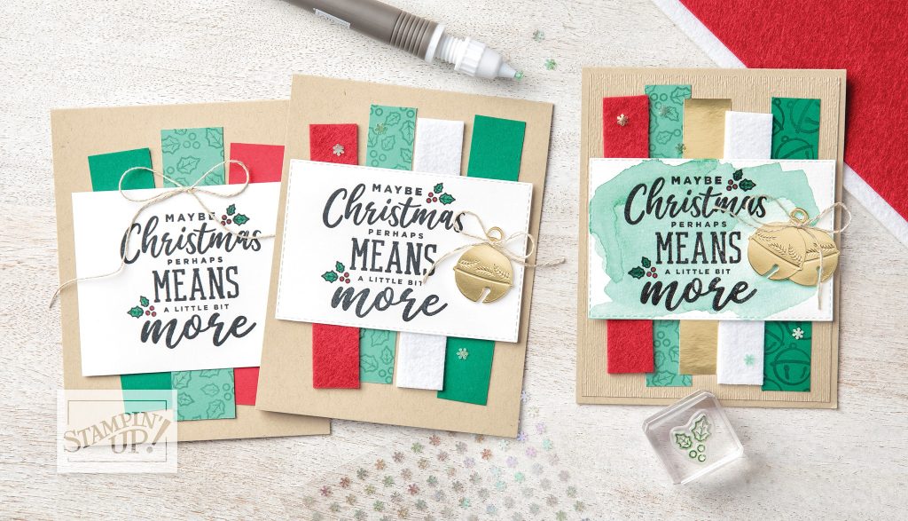 This year’s Stamp a Stack will be delivered to you in your mailboxes! It will include the Christmas Means More stamp set and supplies to stamp 8 cards with envelopes, 2 each of four different designs.