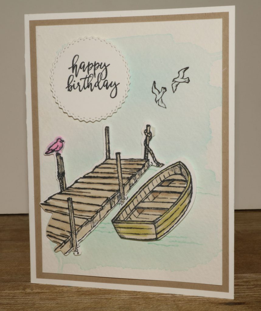Well, my husband’s family “fall birthday” gathering is coming up so I made time to make cards for his parents and each of his siblings.  I think this is one of my favorites.  A little water color technique using the Watercolor Paper and the Balmy Blue and Pool Party inks provide the perfect backdrop for the die cut scene.